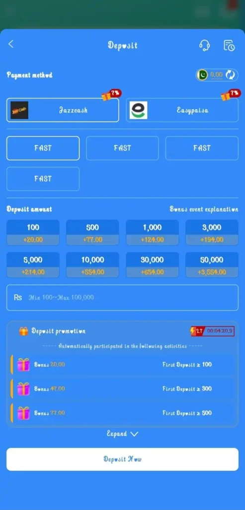 The minimum deposit on many similar gaming platforms starts around PKR 100, depending on the payment method.