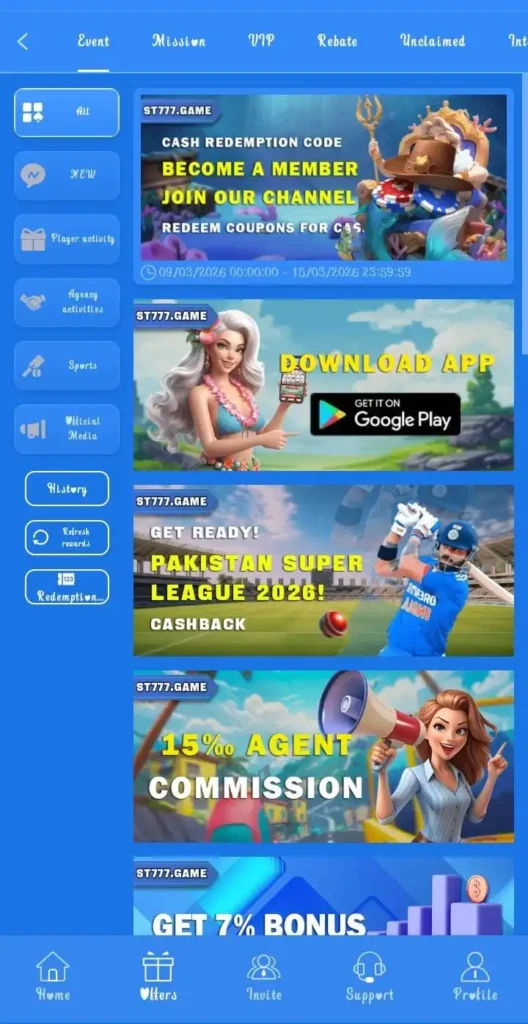 The ST777 APK provides a referral system that allows players to invite friends and earn rewards. When a new user joins through your referral link and makes a deposit, you may receive a commission.